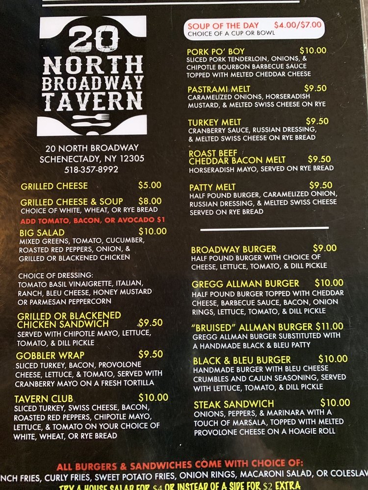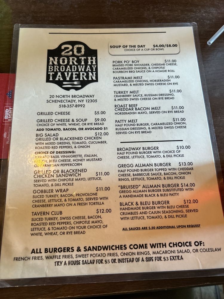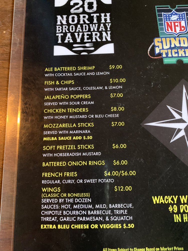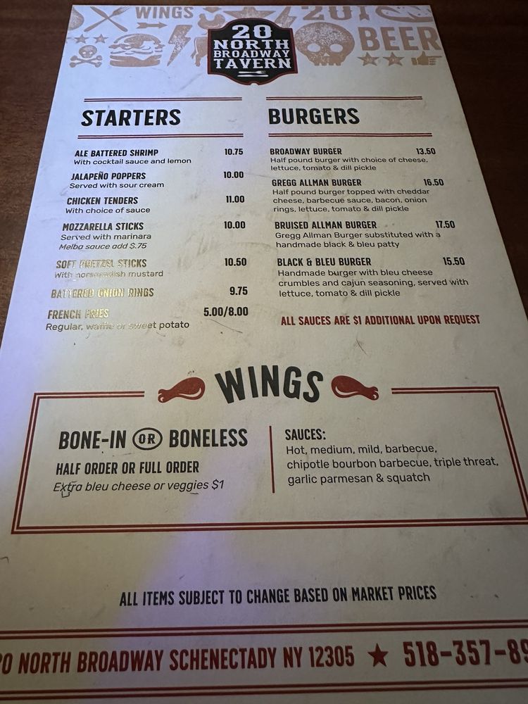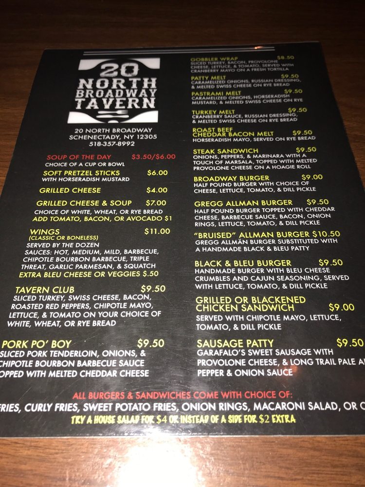 Introducing the menu at 20 North Broadway Tavern, a charming pub in Schenectady, NY, known for its delicious burgers, chicken wings, and comforting pub fare. With options for takeout, delivery, and outdoor seating, this divey spot is perfect for a casual night out. The menu features appetizers like Red Hook Ale Battered Shrimp and Poblanos Stuffed with crab, along with big salads and hearty soups. Customers rave about the award-winning wings, especially the Sasquatch flavor, and the friendly staff make every visit a pleasure. Whether you're looking for a spot to watch the game, enjoy a cold beer, or simply unwind with friends, 20 North Broadway Tavern offers a cozy atmosphere and tasty dishes that will keep you coming back for more.